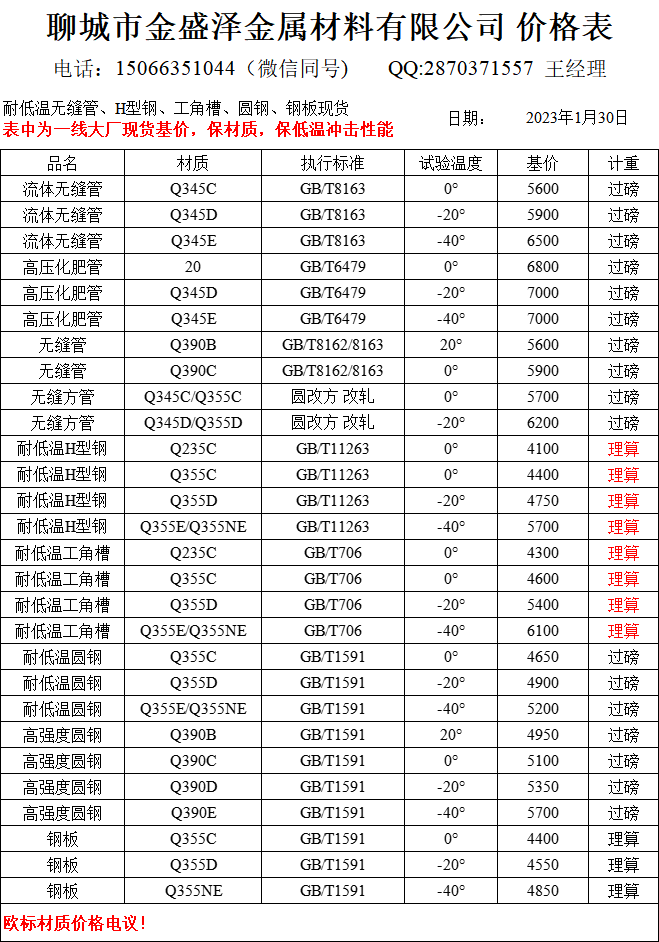 聊城市金盛澤金屬材料有限公司主營低合金/耐低溫無縫管,方矩管,H型鋼,工字鋼,角鋼,槽鋼,圓鋼,鋼板;現貨供應:大無縫、包鋼、煙寶、鳳寶正品耐低溫無縫管,專業加工生產無縫方矩管;經營一線品牌型材:萊鋼/包鋼/馬鋼/日鋼 耐低溫Q235B/C;Q355B/C/D/NE H型鋼(100*100-1000*300) 偏型號H型鋼鋼現貨:250/255,248/124,344/348,394/398,506/201,606/201,458/417,912/302,692/300,792/300 ;萊鋼/馬鋼/宣鋼產 耐低溫槽…